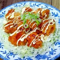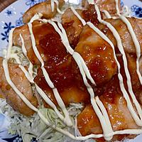簡単!鶏肉で作る、エビチリ風丼のご紹介です。スイートチリソース、ケチャップ、生姜で簡単に味付けできます。トッピングのマヨネーズと青ねぎがアクセントになっておいしいですよ。ぜひお試しくださいね。