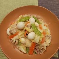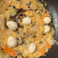 - 3 白菜がしんなりしてきたら合わせ調味料の材料、きくらげ、うずら卵の水煮を加えて、中火でひと煮立ちさせます。