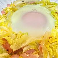 - 4 キャベツがしんなりしてきたら、円形にまとめ、中央にくぼみを作り、卵を割り入れ、水を加えて蓋をし、中火で加熱します。