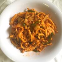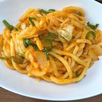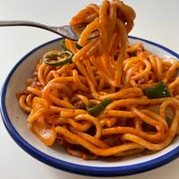 乾燥うどんと鶏ひき肉を組み合わせて、ナポリタン風に仕上げてみました。鶏ひき肉と野菜の旨味に、細めのうどんがケチャップとよく馴染んで美味しいです。お好みの肉や野菜を入れるとアレンジが広がります。冷凍うどんでも美味しく頂けます。是非お試しくださいね。