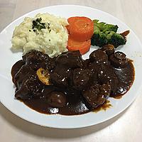 やはり角切り肉は存在感があって豪華です。アレンジしてマッシュルームも入れました。ブーケガルニも入れました。深みがあって、期待通りの美味しさでした。飴色玉ねぎは時間掛かりますが、それだけの甲斐はありますね。奥行きのある味わいで、お店のメニューのように仕上がりました。