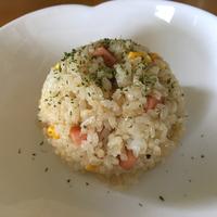 - 5 玉ねぎが透き通ってきたら強火にし、ごはんとコーンを入れ炒めます。
