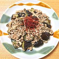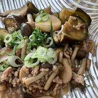 冷凍ストックのキノコを数種類使用、砂糖少なめで紹興酒と豆板醤を加えました。ごま油で炒めています。豚ひき肉とキノコの旨味がナスに染み込み、白米がすすむ味付けで美味しかったです。
