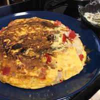簡単で美味しい!パプリカ1個全部入れたので卵5個にしました。ひっくり返すのが大変でした。彼氏にも大好評でした。