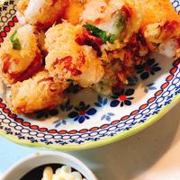 - 5 油を切り、サラダ菜を敷いたお皿に盛り付けて完成です。中濃ソースとマヨネーズをつけてお召し上がりください。