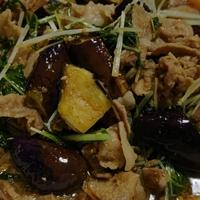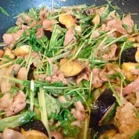 シャキシャキ水菜たっぷり 豚バラとナスのごまポン炒め レシピ・作り方