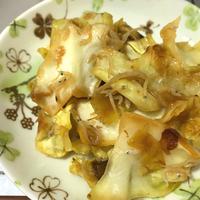 - 2 中火で熱したフライパンにごま油をひき、1を入れ炒めます。キャベツがしんなりしてきたら、ちりめんじゃことかつお節、(A)を入れて炒めます。