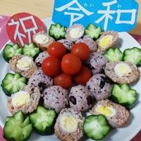 - 5 お皿に2、3、4、ミニトマトを盛り付け、赤飯にごま塩をふって完成です。