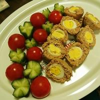 - 1 ボウルに肉だねの材料を入れてこね、4等分にしてうずら卵の水煮を包み、丸く形を整えます。
