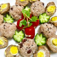 お祝いのお席にぴったりのお赤飯を使った大皿メニューのレシピです。みんなの集まるパーティーにお子様からご年配の方まで楽しめるメニューを盛りこんだプレートです。ひと口サイズなのでみんなで取り分けて食べやすいですよ。