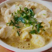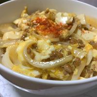 - 4 5分ほど煮込んで玉ねぎがしんなりし、豆腐に味がついたら、2を回し入れて蓋をし、30秒ほど煮たら火を止めます。卵の火加減はお好みで。