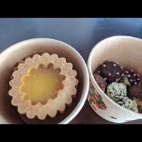 - 8 クッキングシートの上に6を置き、穴を塞ぐように7を注ぎます。上からエディブルフラワーを置き、さらに7をかけ、エディブルフラワーを覆います。6つ同様に作ります。