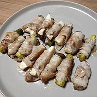 - 2 豚バラ薄切り肉を広げ、1をのせ巻きます。