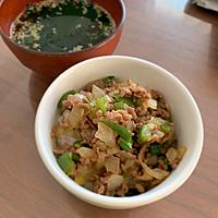 - 2 フライパンを中火に熱し、サラダ油をひいて豚ひき肉を炒めます。