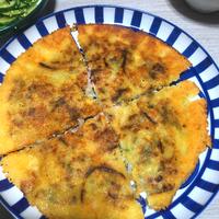 - 5 フライパンを中火で熱し、ピザ用チーズを入れたら、その上に4を流し入れて蓋をして5分程焼きます。