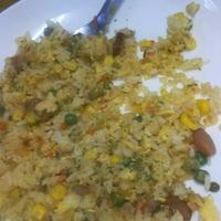 - 4 ごはんがパラパラになってきたら、カニ缶と1、グリンピースを加えて混ぜます。