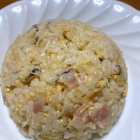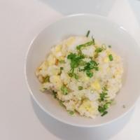 ごはんは通常の水加減より70ml程減らして炊きました。仕上がりの食感は変わりますが、通常の固さのごはんでもお作りいただけます。 卵を入れたら、火が通る前にごはんを加えて混ぜてください。グリンピースが潰れないように、具を入れたら軽く混ぜてください。