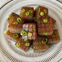 バターで香ばしく焼き上げた食感がステーキそっくりな一品です。こんにゃくに切り込みを入れることで、調味料がしっかり染み込んで味わい深く仕上がります。シンプルな味付けながら、ネギのアクセントと相まって美味しさ抜群。仕上げに一味唐辛子や柚子胡椒を加えると、さらに風味が増して大人の味わいに。こんにゃく嫌いの方でも美味しく食べられると好評です。