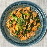 - 5 中火で熱したフライパンにごま油をひき、1を入れ香りが出たら、4を入れ炒めます。