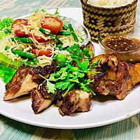 もも肉はシーユーカオ・シーユーダム・ナンプラー・黒胡椒・すり潰したニンニク+レモングラス+コブミカンの葉を混ぜた漬けダレに3〜4時間漬けて予熱済みグリルで15分加熱。