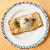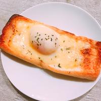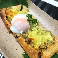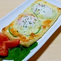 - 2 アルミホイルを敷いた天板に油揚げをのせ、1を塗り、温泉卵とピザ用チーズをのせます。