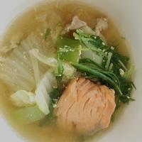 - 6 豚バラ肉の色が変わったら4、2、1の緑の部分の順に入れ、蓋をして弱火で5分程鮭に火が通るまで煮たら、みそを溶き入れて完成です。