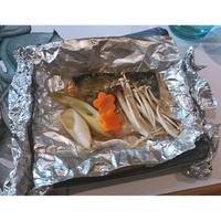 - 4 アルミホイルに2を入れ、両面に3を塗り、1と絹さやを入れて閉じ、天板にのせてオーブントースターで15分ほど焼きます。