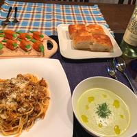 メインはボロネーゼ、サイドはスナップえんどうとクリームチーズのスモークサーモン巻きです。