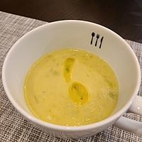 グリンピースの風味を感じられるスープで美味しかったです。玉ねぎの代わりにベルギーエシャロット使用、目分量ですが倍量以上の牛乳で伸ばしました。仕上げの生クリームは無し、オリーブオイルのみで。