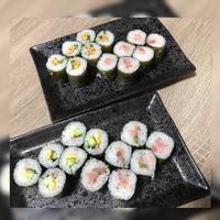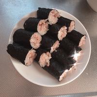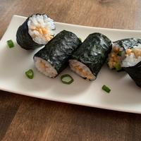 納豆とキムチを巻いた細巻きです。納豆にごま油としょうゆを混ぜ、キムチと一緒に巻くことで、韓国風にしました。普通の納豆巻きに少し手を加えるだけで、一味違った一品になりますのでおすすめです。是非お試しください。