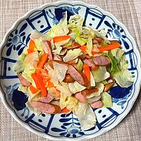 - 1 キャベツはざく切りに、人参は縦に1cm幅に切ってから薄切りに、ウインナーは斜めに5mm程度の薄切りにします。