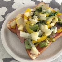 夏野菜をスライスしてたくさんのせたピザトーストです。アンチョビ、ニンニクの風味と野菜はとっても合います。オリーブオイルで和えてから焼くことで、火の通りが早くなり、アツアツでジューシーな野菜を楽しめます。ぜひお試しください。
