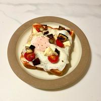 ナスは細かく切り、チーズと共にパンへ。最後に目玉焼きを乗せました!