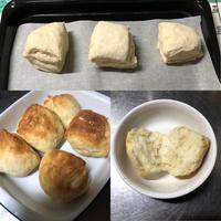 生地を常温で折り込む作業を3回入れることで生地に空洞ができ、軽い食感に仕上がります。準強力粉がない場合は強力粉8対薄力粉2の割合でお作りすることもできます。 オーブンは必ず予熱を完了させてから焼いてください。 予熱機能のないオーブンの場合は温度を設定し10分加熱を行った後、焼き始めてください。 ご使用のオーブンの機種や使用年数等により、火力に誤差が生じる事があります。焼き時間は目安にし、必ず調整を行ってください。 焼き色が付きすぎてしまう場合は、アルミホイルをかけてください。