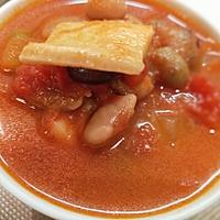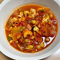 - 3 ミックスビーンズ、シーフードミックス、スープの材料を入れて中火で加熱します。ひと煮立ちしてからさらに5分程煮て、全体に味がなじんだら火から下ろします。