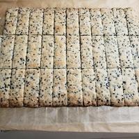 No.1007 今回、黒ごまと白ごま半々にして作りました😊簡単に作れるのに本当にパキパキ割れてすごく楽しいし、めっちゃくちゃ美味しかったです😍ごま油とごまの風味が最高でした😋でも一つ学んだことがあってそれは、底には付かないけどなるべく深く線をつけた方が良いという事です😃焼くと意外と膨らむので、浅い線だと埋まってしまうと思います😮なので少し深めにやったら上手く出来ました😆割るのも楽しいし味も本っ当に美味しくて、母にも大好評だったのでまた作りたいです✨