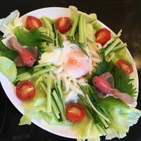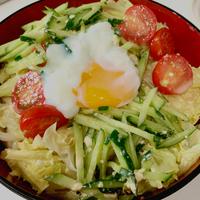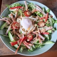 たっぷりのレタスやトマトなど夏野菜を使った、さっぱりと食べやすい一品です。ごまドレッシングの風味が効いた麺との相性は抜群で、カニカマやツナを加えるアレンジも人気です。温泉卵を絡めて食べるのがポイントで、黄身のコクがうどんに程よくからみます。洗い物も少なく簡単に作れるので、暑い日のランチにぴったり。野菜をたくさん消費できるヘルシーメニューとしても重宝します。