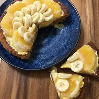 タルト生地はホットケーキミックスで作るものを参考にして、オレンジではない柑橘類とバナナを組み合わせました。