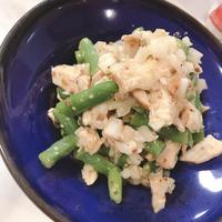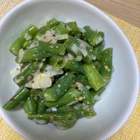 メインはサヤインゲンだけですが、タマネギたっぷりのドレッシングで和えることで、しっかり一品のサラダになります。サヤインゲンといえばごま和え、マヨ和えがポピュラーですが、たまにはこんな味付けはいかがでしょうか。