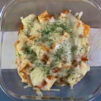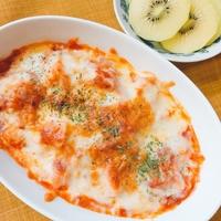 - 7 耐熱皿に6をのせてピザ用チーズをかけて天板にのせ、オーブントースターで5分程、焼き色がつくまで焼きます。