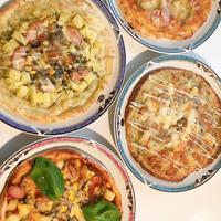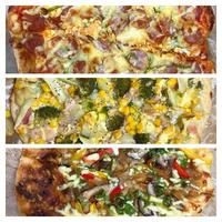 具は玉ねぎ、ピーマン、パプリカ、ミニトマト、エビ、ウインナー、コーン、チーズなどで組み合わせて3枚作りました!