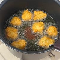 - 2 フライパンの底から3cm程の高さまで揚げ油を注ぎ、170℃に熱して1をスプーンで丸く形を整えながら入れます。火が通るまで3分ほど揚げたら油切りをします。