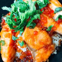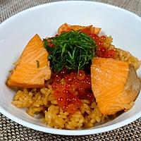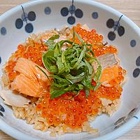 - 6 炊き上がったら鮭を取り出してごはんをほぐします。丼に盛り付け、イクラ、1をのせて完成です。
