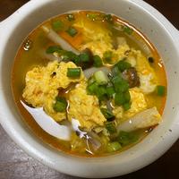 - 5 鶏がらスープの素を入れ、溶き卵を回し入れ、卵に火が通ったら、(A)を加え味を調え、火からおろします。