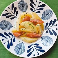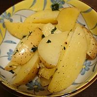 - 1 じゃがいもは皮つきのまま8等分のくし切りにします。耐熱ボウルに入れてラップをかけ、600Wの電子レンジで5分程加熱します。