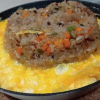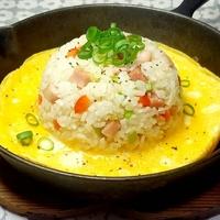 スキレットならではの熱々の美味しさがたまらない一品です。レンジを使って手軽に作れるのに、卵はふわふわの食感に仕上がります。材料はベーコンやチャーシュー、豚肉など好みの具材でアレンジ可能。プーンと香るごま油の風味が食欲をそそり、きざみ海苔や紅しょうが、チーズなどをトッピングしても楽しめます。見た目もおしゃれで、休日のランチにぴったりの一品です。