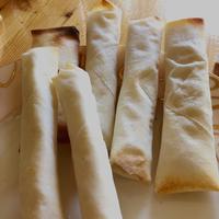 - 4 春巻きの皮に3をのせて包み、巻き終わりに水溶き小麦粉を塗って留めます。