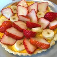 パイシートで焼いたタルト型に、たっぷりの手作りカスタード、いちご、バナナをのせたタルトのご紹介です。仕上げにレモン汁を加えたナパージュを塗ってフルーツをキラキラと色鮮やかに仕上げました。ぜひ作ってみてくださいね。