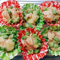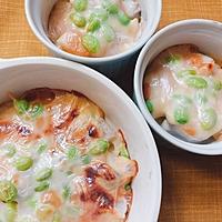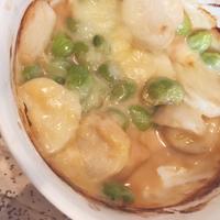 - 3 耐熱皿に1を並べ2を塗り、枝豆を散らし、スライスチーズを乗せます。
