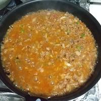 変更点:フライパンで豚挽肉300、玉ねぎなし、チリ多め、コンソメ小さじ2、粉チーズ